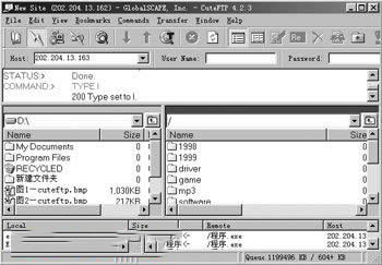 添加了站点之后,在站点网站建设管理,网站管理后台窗口中选择一个FTP(注意只能选择一个FTP站点),与之建立连接。连接到服务器以后,CuteFTP的窗口被分成左右两个窗格。左边的窗格显示本地硬盘的文件列表,右边的窗格显示远程硬盘上的文件列表。文件列表的显示方式和Windows的资源网站建设管理,网站管理后台器完全一样,如图2所示。